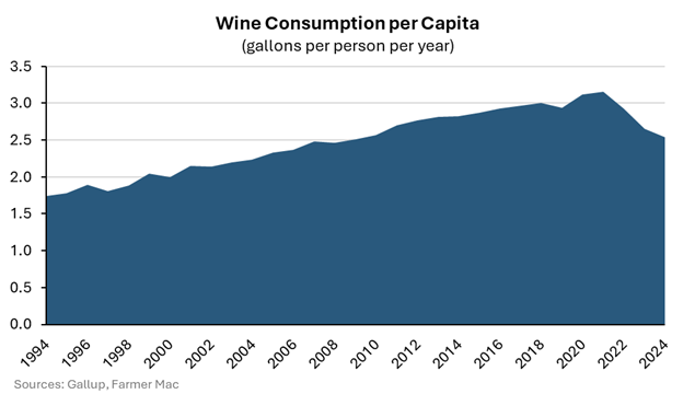 ‘Tis the season for holiday cheer! Unfortunately for U.S. vineyard owners, holiday feasts are likely to feature less wine this year. U.S. per capita alcohol consumption reached a 90-year low in 2024. A challenging concoction of shifting demographic preferences, health movements, non-alcoholic alternative drinks, and the increasing prevalence of weight loss drugs (i.e., GLP-1s) has resulted in significant headwinds for the entire alcohol industry in 2025. In fact, Gallup data in 2025 shows the proportion of U.S. adults who say they consume alcohol dropped to the lowest level in the survey’s 90-year history. Furthermore, according to Gallup data, nearly two-thirds of 18- to 34-year-olds say consuming alcohol is bad for their health, up from only 30% a decade ago. Despite the many perceived benefits of enjoying wine in moderation, it has not been immune to this trend.