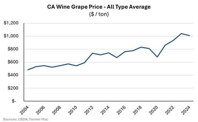 Perhaps unsurprisingly, the downward trend in wine consumption has spilled over into lower wine grape prices. According to the USDA’s National Agricultural Statistics Service (NASS) Preliminary Grape Crush Report, the average California wine grape price declined 3% per ton in 2024, the first decline since 2020. While this decline may not seem all that dramatic, it occurred despite a simultaneous drop in wine grape production. According to the USDA’s National Agricultural Statistics Service (NASS) Preliminary Grape Crush Report, the 2024 California grape harvest only totaled approximately 2.89 million tons—a 22% decline from 2023 and the smallest crop since 2004.