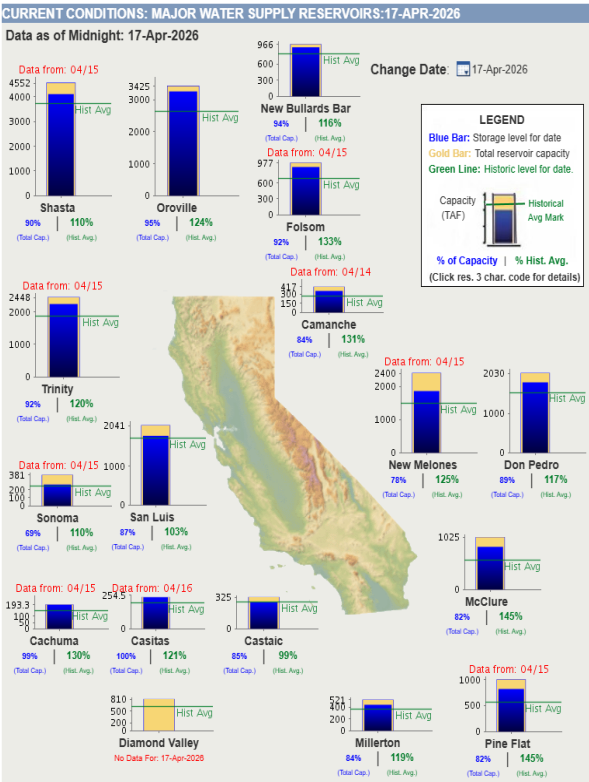 While California technically entered drought-free status this winter, the state—and much of the West—is facing a “snow drought.” Mountain snowpack, which supplies critical irrigation water, is well below normal. The Sierra Nevada’s snow water equivalent is just 59% of average, and key basins in the Rockies and High Plains are 30–50% below normal. Reservoirs on the North Platte River, which supports agriculture in Nebraska and Wyoming, are only 32–53% full.