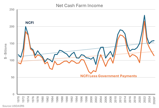 The revised data shows 2025 production expenses reached $473.1 billion (nearly $6 billion above the prior estimate), while actual government aid was $10 billion less than anticipated due to delayed payments. As a result, the new 2026 outlook starts from a weaker base. Rather than growing from a strong rebound year, farm income in 2026 is forecast to be only flat to slightly higher than 2025’s depressed level.