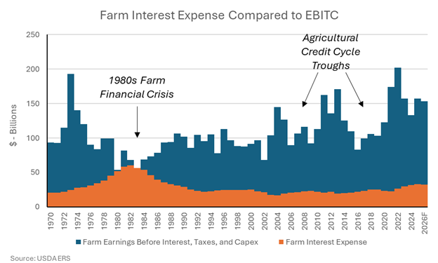 At the same time, interest costs have surged. Annual farm interest expense is expected to top $33 billion in 2026, a record high. Servicing this debt is consuming a greater share of farm income and drawing down liquidity. The chart below illustrates how interest payments now represent a larger percentage of farm operating earnings (EBITC) compared to recent years, signaling that more of farmers’ cash is being swallowed by debt service. Roughly 21% of farm EBITC is expected to be absorbed by interest expenses, up from 12% experienced in 2021.