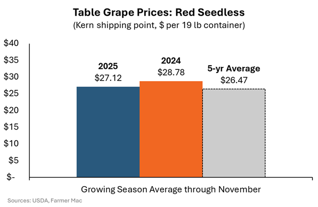 This isn’t to say that table grape producers haven’t faced challenges. Indeed, table grape prices have been relatively stagnant over the past couple of growing seasons. Prices for red seedless grapes, for example, have averaged modestly lower through November than the 2024 crop, while remaining slightly higher than the 5-year average.