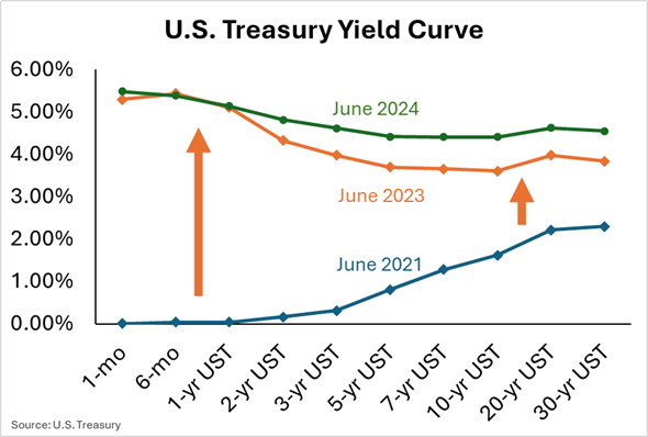 When considering only U.S. Treasury (UST) benchmark rates, this loan-selection phenomenon appears counterintuitive. Producers began selecting shorter-duration loans after the yield curve inverted (when the short end of the yield curve rose higher than the long end of the yield curve). In June 2023, the 1-year UST implied rate was above 5.00% while the 10-year UST implied rate was approximately 3.60%. However, the U.S. yield curve does not fully reflect the interest rates farm borrowers pay.