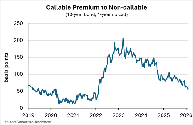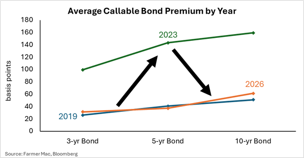 The necessity to fund loans with some callable bonds has led to higher long-term interest rates for borrowers. The graph below highlights the issuance cost premium for callable 10-year bonds relative to non-callable over the past seven years. At peak levels, the interest rate on callable bonds was over 200 basis points higher than that of non-callable bonds. Unfortunately for producers, that increased lender funding costs, which were then reflected in the interest rates they received on their new loans.